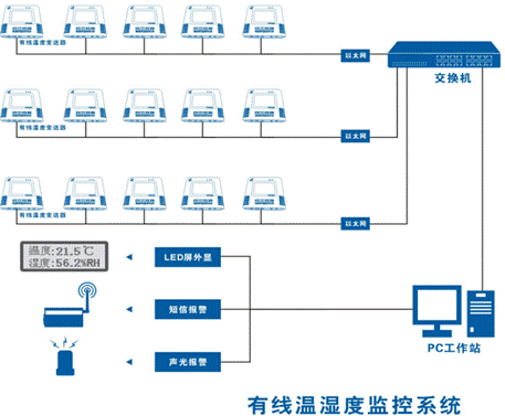 方案采用分布式智能网络型监控系统,采用485总线技术、以太网技术等传输方式,被监控的点位可根据需要扩展硬件种类,增加监控点数量,监控终端采用普通的PC电脑。基于现场总线的方式的传输,采用智能温湿度记录变送器,便于现场布线,记录平台采用PC计算机,支持数据导出和以太网传输,及无线传输。软件界面图形化,采用微软SQL server数据库进行温湿度记录的存储,并且数据可以手动或自动进行备份。动态数据库技术保证海量数据压缩存储需要的同时可以迅速查询。根据数据库服务器硬盘的大小,历史数据一般可以保存十年以上。将每一台设备的实时温(湿)度数据在监控电脑上进行显示与记录。通过友好的软件界面可任意设定每个区域的温(湿)度上下限以及报警方式,报警信息由短信报警器发送至多个管理员手机。